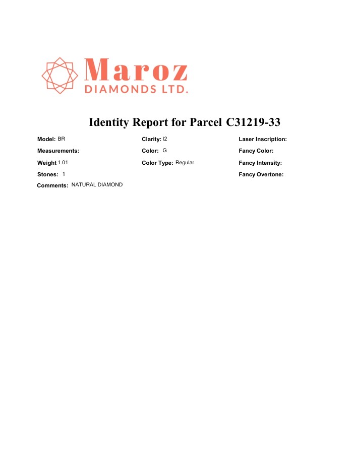 DIAMANTE 1,01 CARATI COLORE G - PUREZZA I2 - TAGLIO BRILLANTE - CERTIFICATO GEMMOLOGICO MAROZ DIAMONDS LTD MEMBRO ISRAEL DIAMOND EXCHANGE - C31219-33