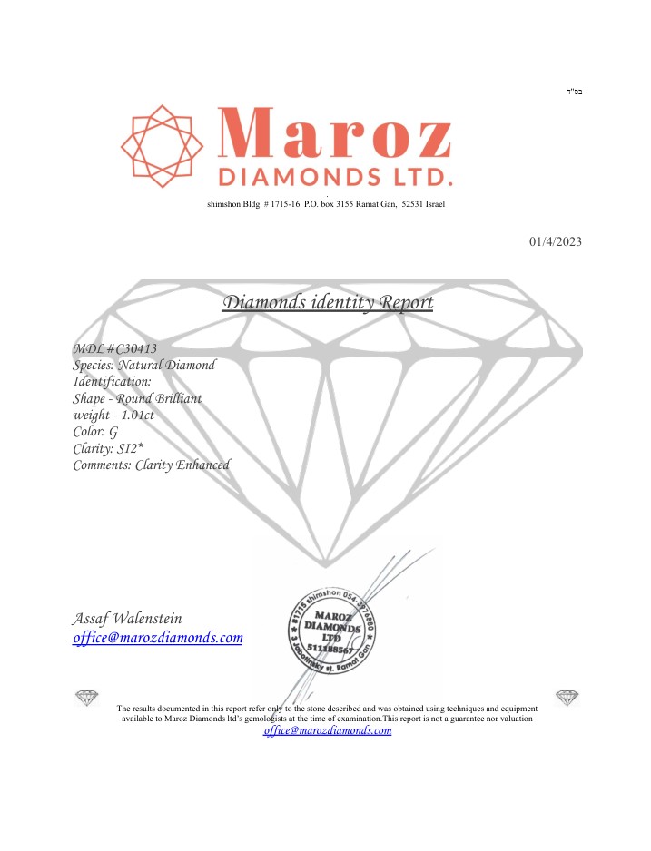 DIAMANTE NATURAL POLISHED 1,01 CARATI COLORE G - PUREZZA SI2* - TAGLIO BRILLANTE - CERTIFICATO GEMMOLOGICO MAROZ DIAMONDS LTD MEMBRO ISRAEL DIAMOND EXCHANGE - C30413C