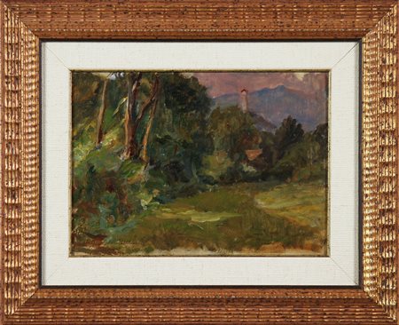 ANONIMO Paesaggio. Olio su cartone. Cm 35,00 x 25,00. Firma in basso a destra. Cornice presente