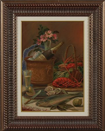 PECI ANDREA ENRICO (1885 - 1974) Natura morta con pesci. Olio su tavola. Cm 35,00 x 50,00. Firma in basso a destra. Cornice presente