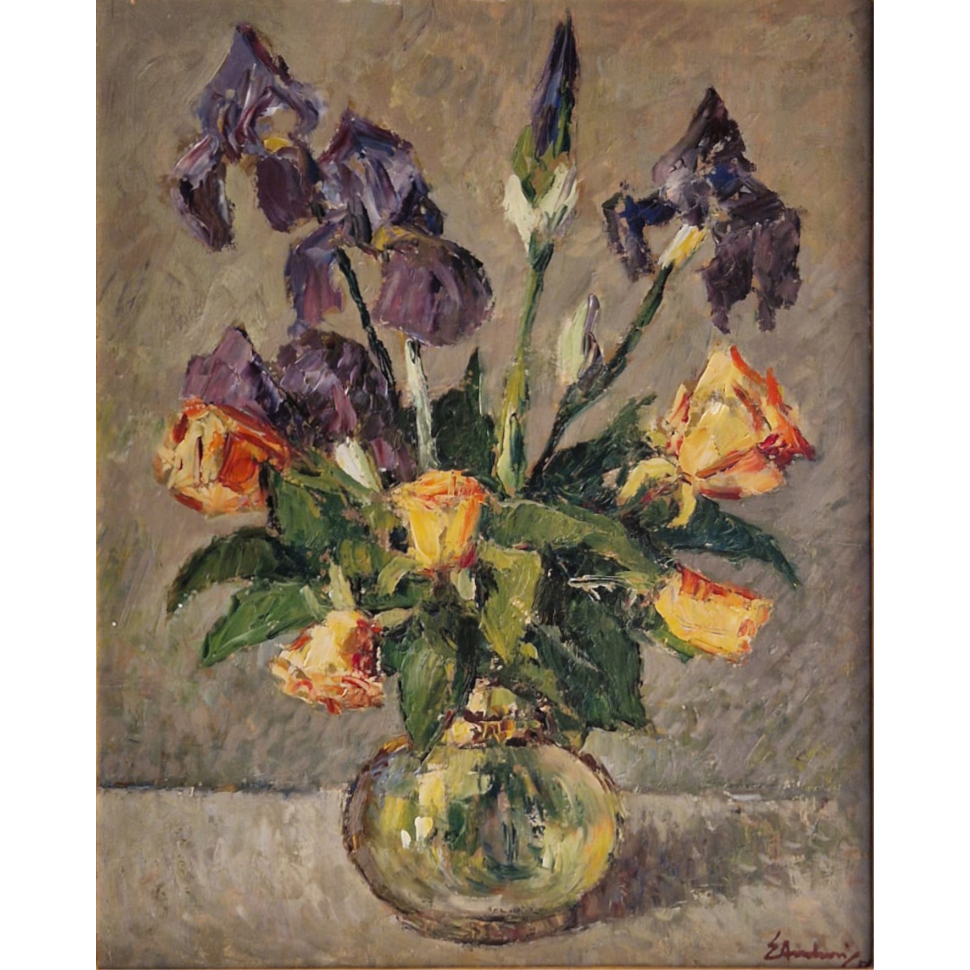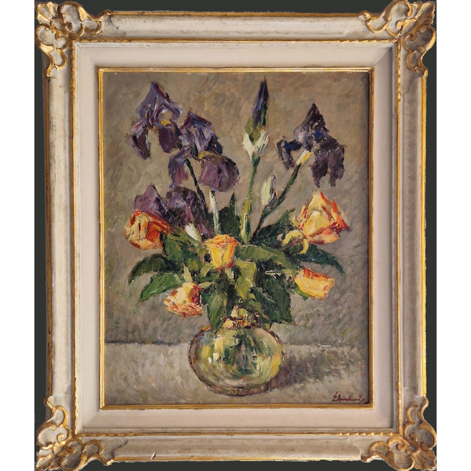 Elmo Ambrosi, Vaso con fiori gialli e viola, olio su tavola, cm 50x4, cornice coeva