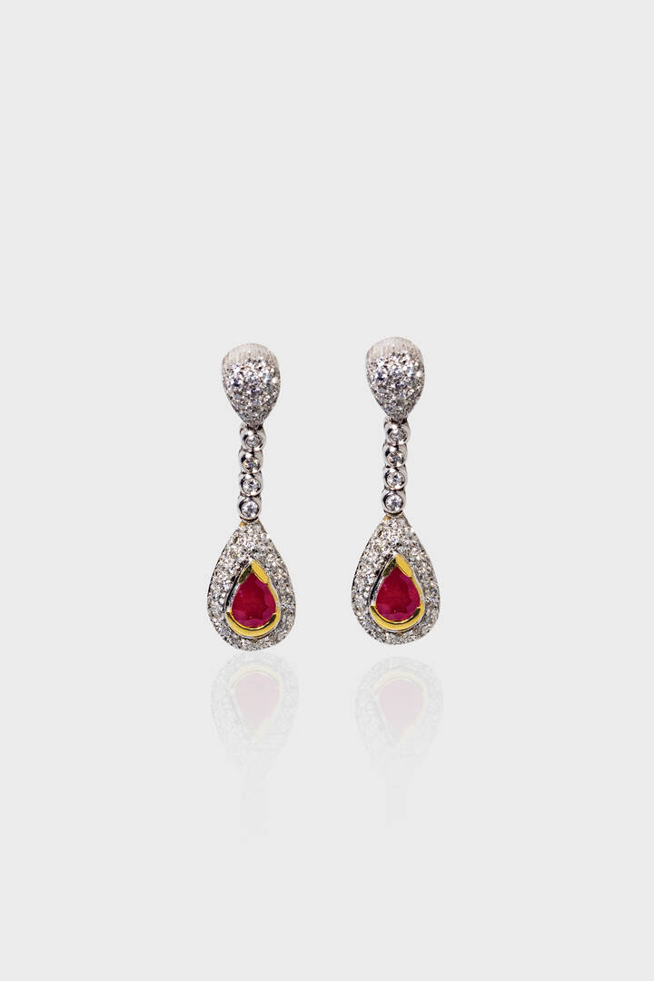 pendenti, in oro bianco e giallo, con pavé di diamanti taglio brillante per totali ct 1,50 ca e due rubini taglio a goccia per totali ct 1,50 ca