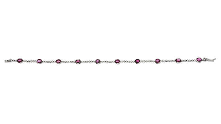 in oro bianco, composto da ovale con rubini taglio ovale per totali ct 3,78 ca, intervallati da diamanti taglio brillante per complessivi ct 0,65 ca, probabile colore G-H, purezza IF-VVS