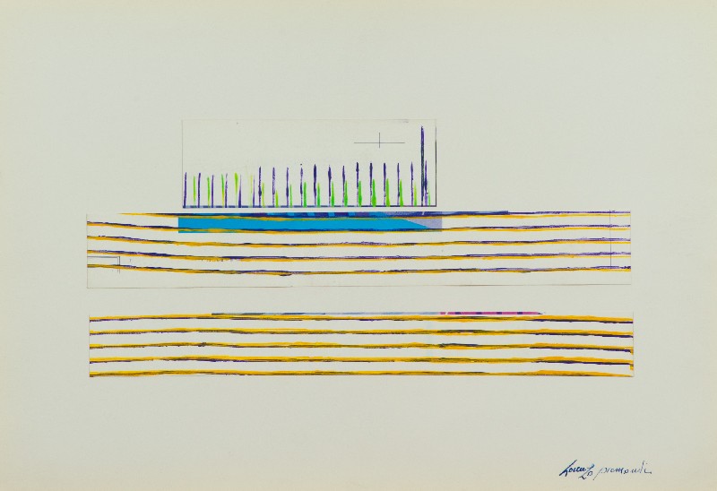 Lorenzo Piemonti (Carate (Mi) 1935) ACCELERAZIONE Acrilici e collage su carta, cm. 35x50 Firmato in basso a destra. Sul verso: titolo e timbri dell'Artista con Archivio n° 497/2010.