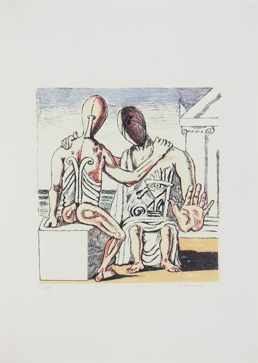 DE CHIRICO GIORGIO (1888 - 1978) Senza titolo. Litografia. Cm 50,00 x 70,00. 12/99. Tiratura e firma in basso a matita. Timbro a secco Alberto caprini stampatore, Roma, in basso a sinistra e Giorgio De Chirico al centro.