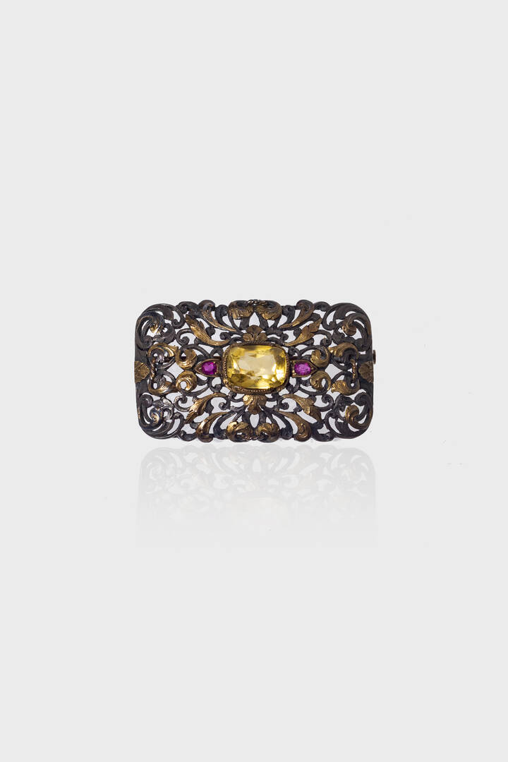 in oro giallo a bassa caratura ed argento, XIX secolo, di forma rettangolare interamente decorata a racemi vegetali. Al centro quarzo citrino sintetico e due rubini.