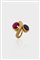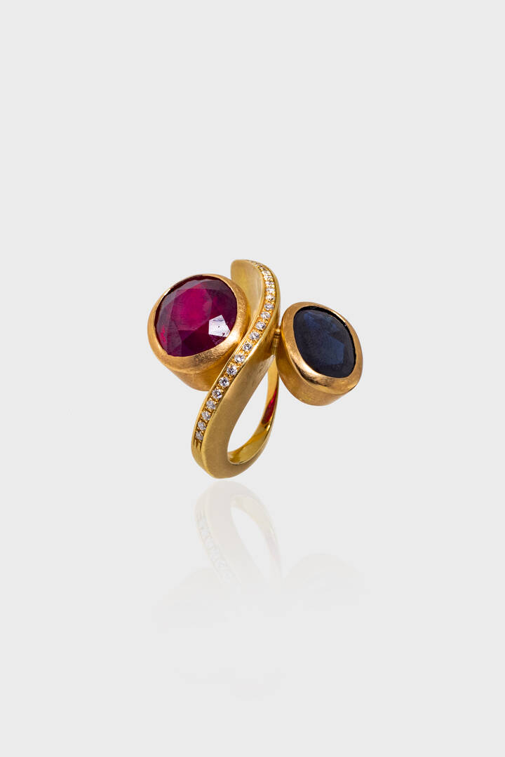 Anello in oro rosa, firmato "Dante di Lilla", modello contrarié, con zaffiro taglio ovale di 5,0 ca e rubino taglio ovale di ct 8,0. Diamanti taglio brillante per totali ct 0,15 ca