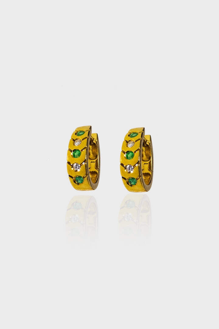 in oro giallo, a cerchio ovalizzato, con segmenti anteriori con smeraldi e diamanti taglio brillante per totali ct 0,15 ca