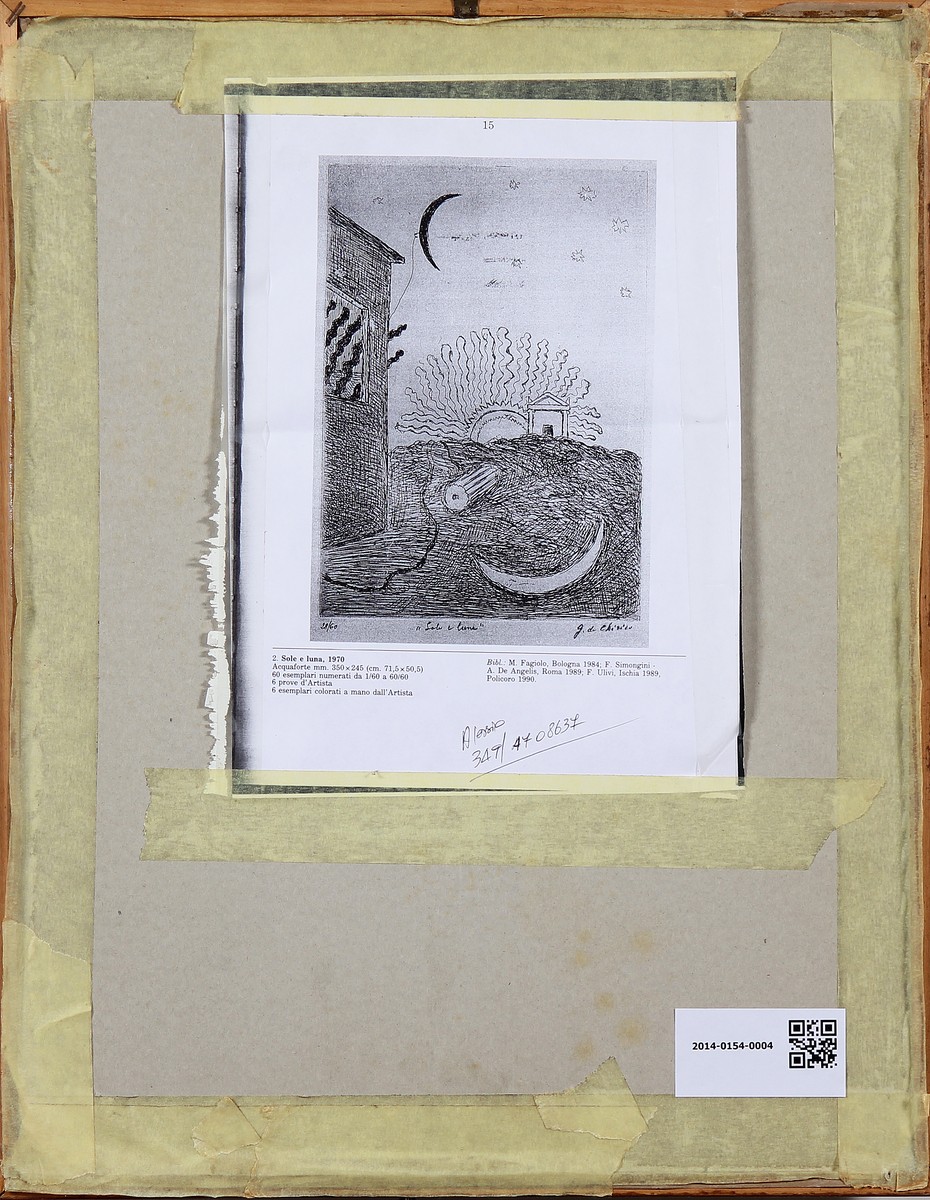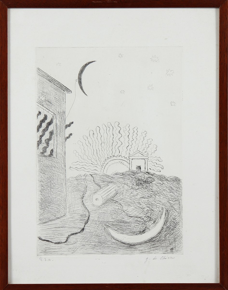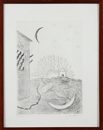 DE CHIRICO GIORGIO (1888 - 1978) Sole e Luna. 1970. Acquaforte. Cm 36,50 x 47,50. P.A. Dimensioni lastra: 34.5x24 Cm. Tiratura e firma in basso a matita. Cornice presente