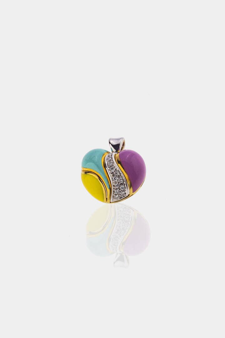 in oro bianco, a forma di cuore, con smalti policromi e piccoli diamanti taglio brillante per totali ct 0,20 ca