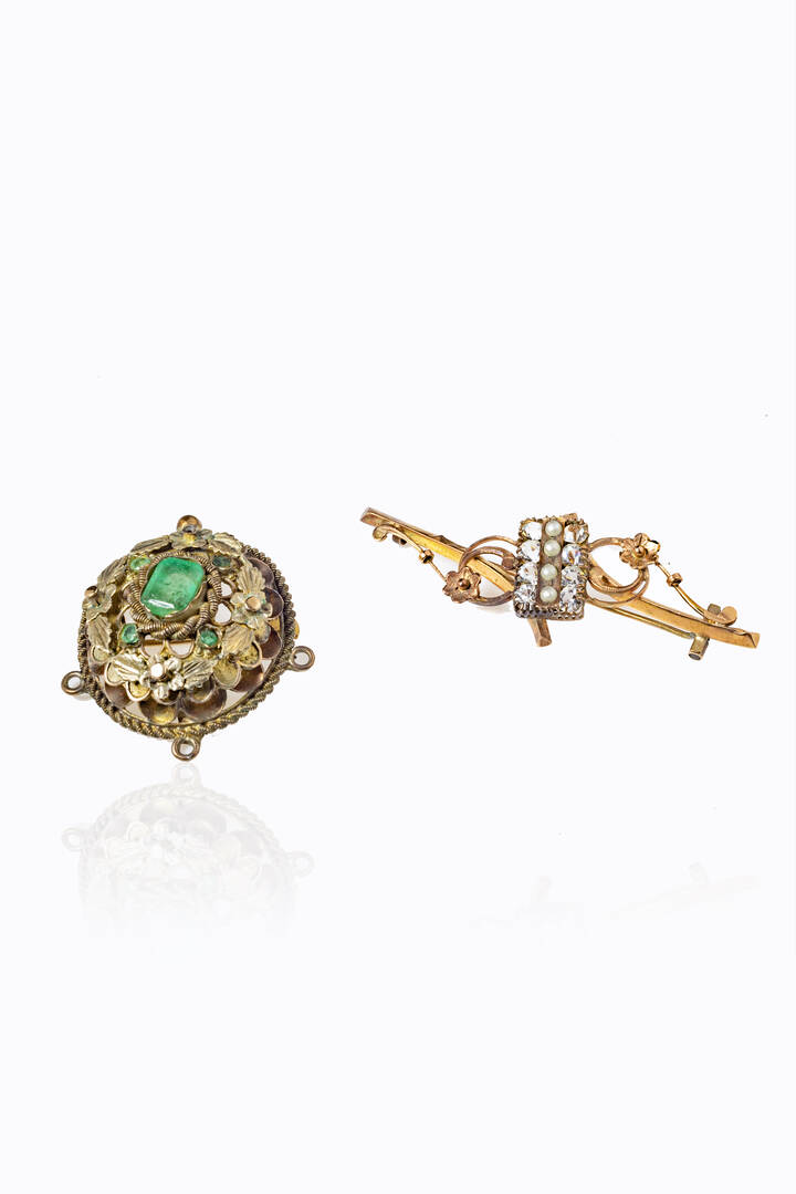 -in oro rosa a bassa caratura, XIX secolo, a barretta con gemme sintetiche e perline. Peso gr 4,1. Cm5,5x2