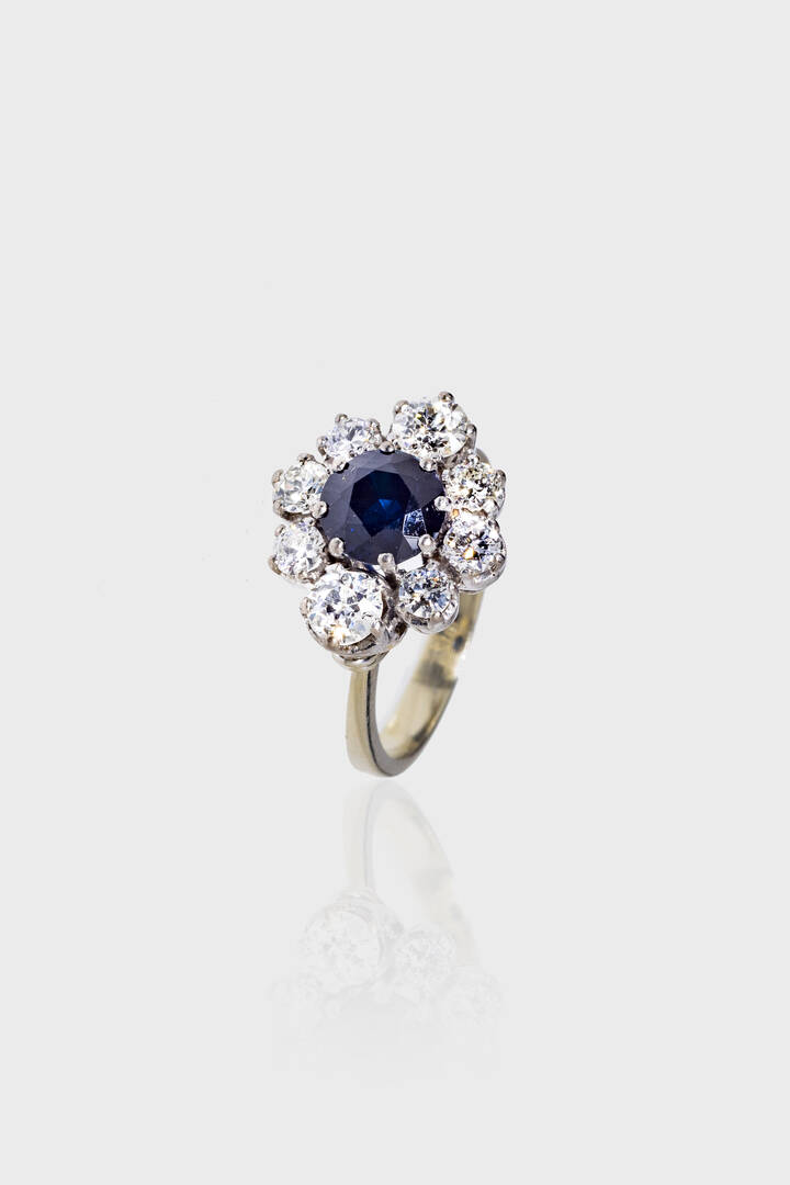 in oro bianco, anni '60, sommità a margherita, al centro zaffiro taglio ovale (piccole abrasioni della cintura) di ct 1,50 ca, circondato da diamanti tagli brillante di vecchio taglio per totali ct 1,30 ca