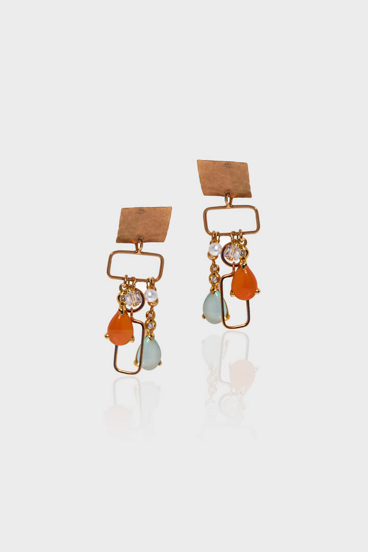 in oro rosa: ai lobi elementi geometrici quadrati satinati; da cui dipartono elementi rettangolari con frange in opale di fuoco e acquamarina milk taglio a goccia; due cubi in topazio bianco e due perline. Diamanti taglio brillante per totali ct 0,08 ca