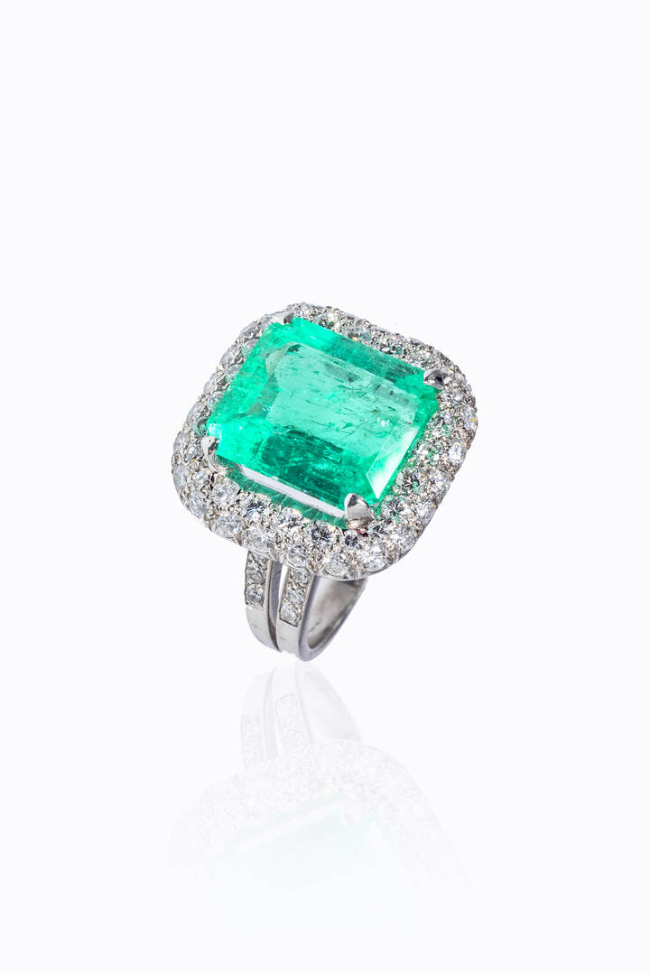 in oro bianco al centro smeraldo taglio ottagonale a gradini di ct 6 ca, contornato da diamanti taglio brillante per totali ct 1,20 ca, colore G purezza VVS-VS