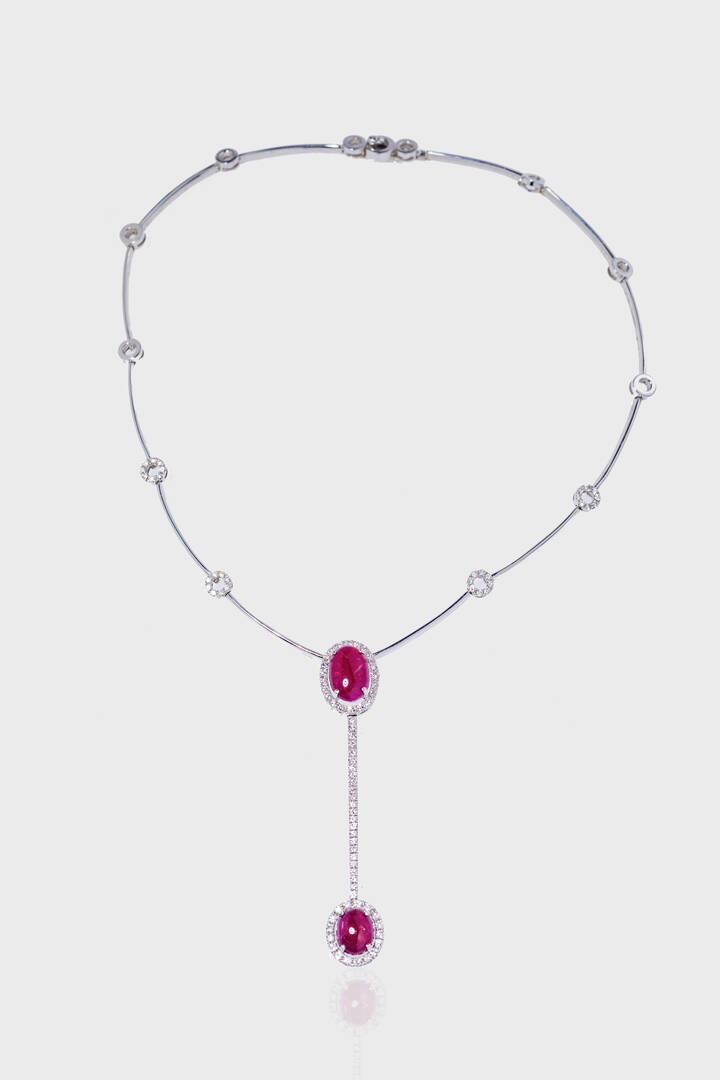 in oro bianco composto da segmenti rigidi raccordati da cerchi in pavé di diamanti taglio brillante per totali ct 1,0 ca, probabile colore F-G, purezza IF-VVS; al centro due rubini taglio ovale cabochon per totali ct 6,50 ca