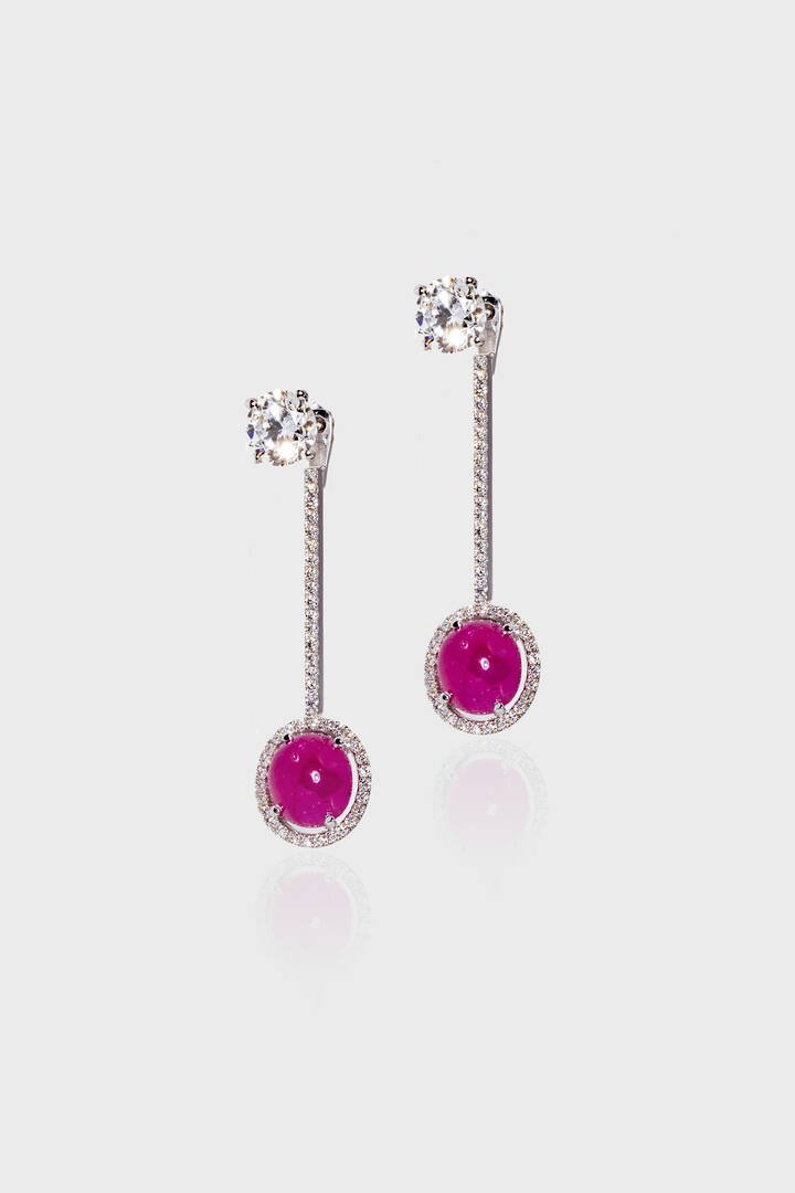 pendenti, in oro bianco, ai lobi due diamanti taglio brillante per totali ct 2,40 ca, probabile colore F, purezza SI1, corpo a barretta con diamanti taglio brillante per totali ct 0,60 ca, terminanti con rubini cabochon per totali ct 5,0 ca