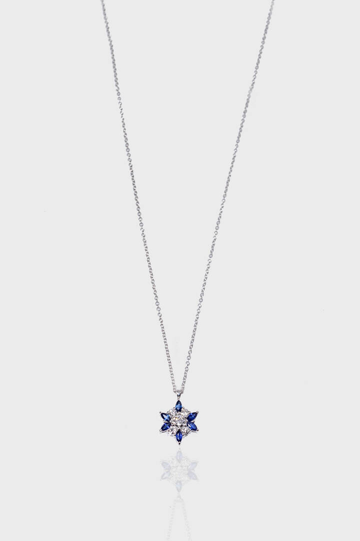 in oro bianco, a forma di fiore con zaffiri taglio navette per totali ct 0,30 ca e diamanti taglio brillante per totali ct 0,20 ca, probabile colore G-H, purezza IF-VVS