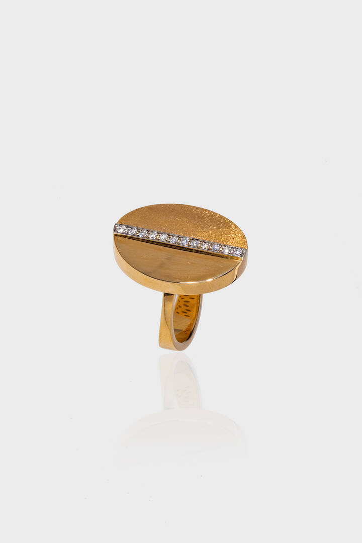 in oro rosa, sommità ovale, lucida e satinata, al centro fila di diamanti taglio brillante per totali ct 0,15 ca, probabile colore G-H, purezza IF-VVS