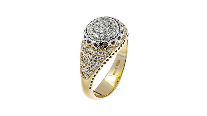 in oro giallo, sommità bombata, con parte centrale in oro bianco e pavé di diamanti taglio brillante per totali ct 0,76 ca
