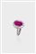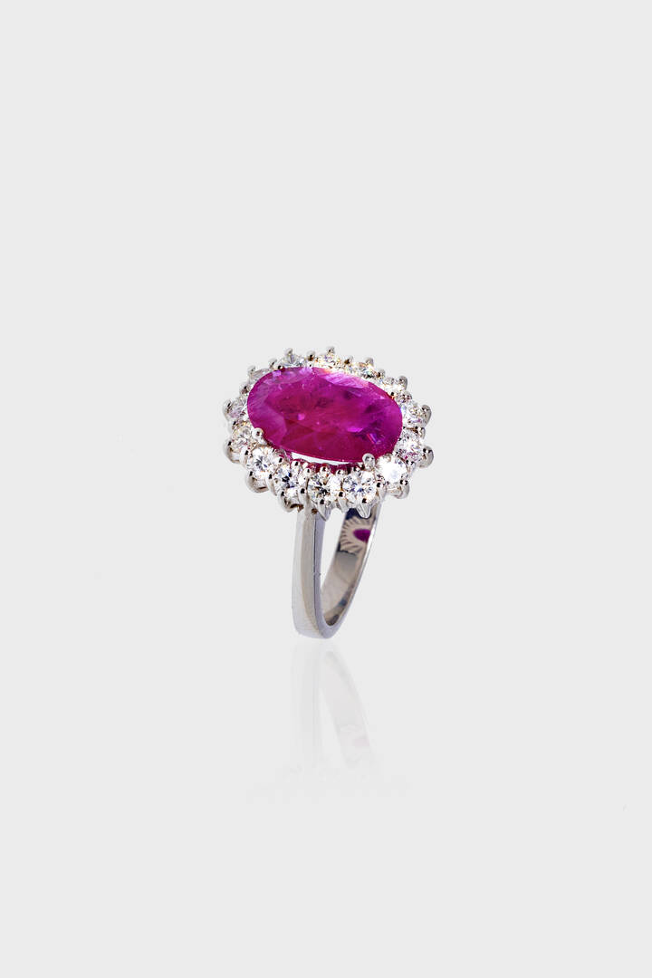 in oro bianco, sommità a margherita con al centro rubino Burma, provenienza Myanmar, (indicazione di riscaldamento), taglio ovale di ct 2,183; contornato da diamanti taglio brillante per totali ct 0,60 ca.