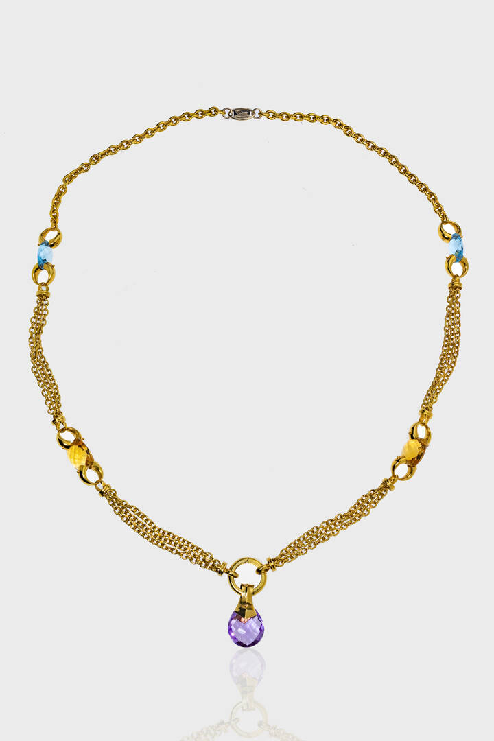 in oro giallo a maglia ad anelli di varie misure; topazi azzurri taglio ovale briolette; quarzi citrini briolette e ametista taglio a goccia briolette