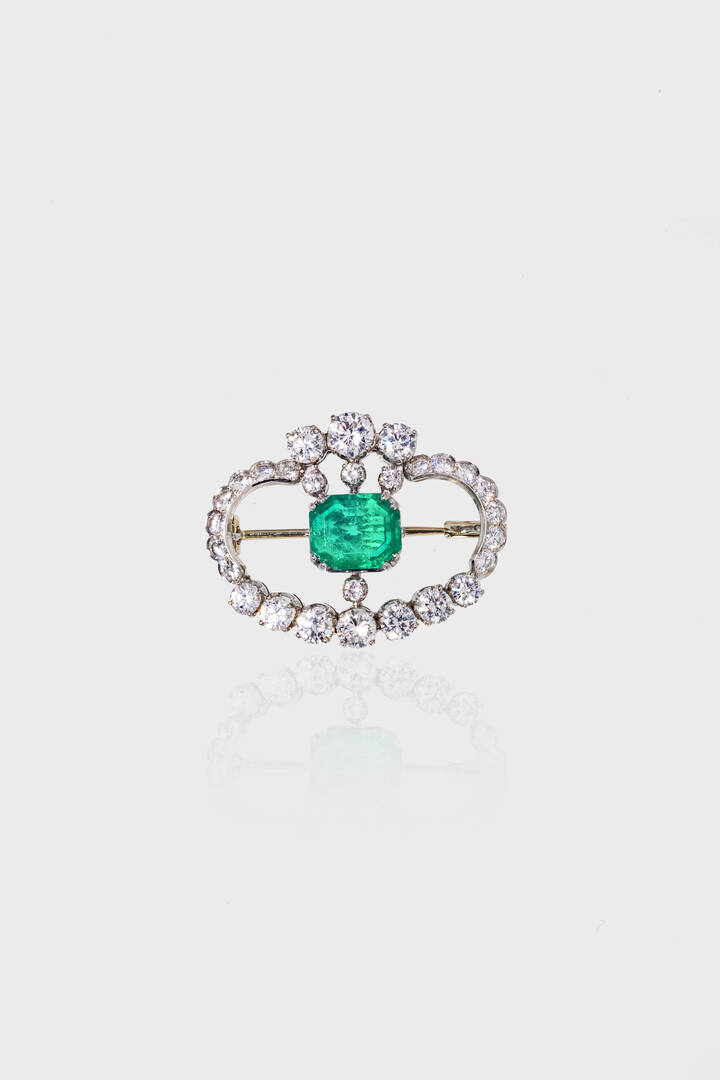in oro bianco, anni '40, a voluta, con al centro smeraldo colombiano taglio ottagonale a gradini di ct 2,50 ca e diamanti taglio brillante di vecchio taglio per totali ct 2,50 ca.