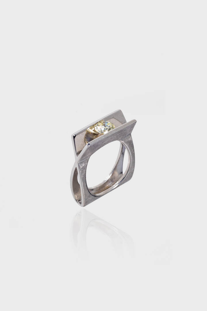 Anello in oro bianco lucido e satinato, eseguito da "Dante di Lilla", al centro un diamante taglio brillante di ct 0,60 ca, probabile colore G-H, purezza IF-VVS