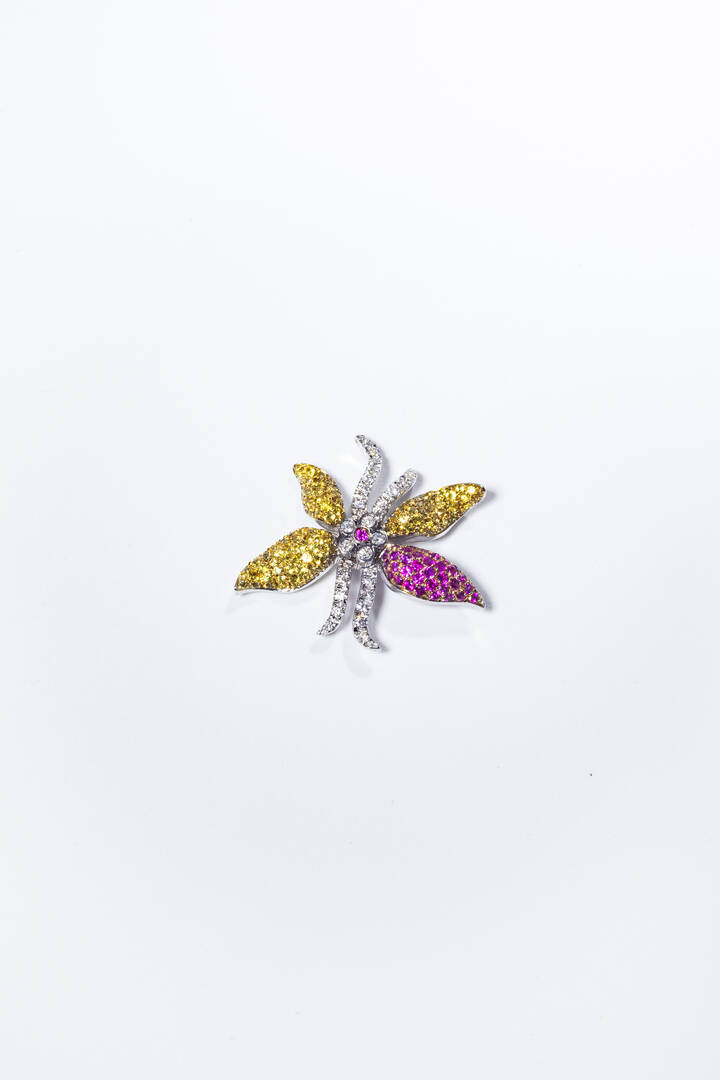 in oro bianco, a forma di fiore, con petali in pavé di diamanti taglio brillante per totali ct 0,25 ca, rubini taglio rotondo per totali ct 0,80 ca e zaffiri gialli per totali ct 2,50 ca.