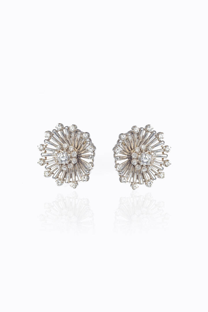in platino, di forma rotonda anni '50, lavorati a fiore con diamanti taglio brillante per totali ct 1,10 ca