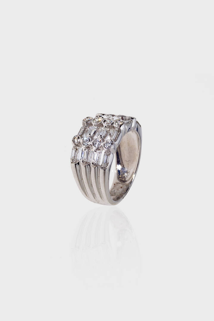 in oro bianco, a fascia, sommità con diamanti taglio baguette e brillante per totali ct 1,30 ca, probabile colore G-H, purezza IF-VVS