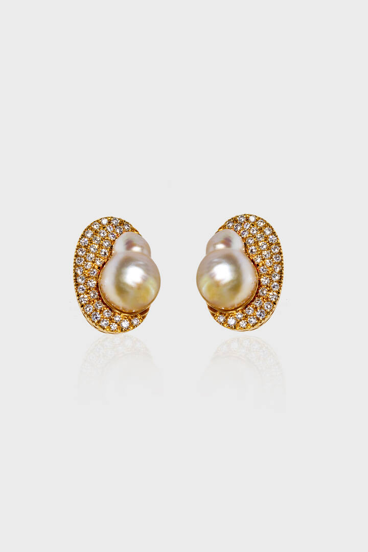 Coppia di orecchini in oro giallo, a clip, firmati "Repossi" d forma ovale con due perle scaramazze e diamanti taglio brillante per totali ct 0,90 ca, probabile colore G, purezza VVS