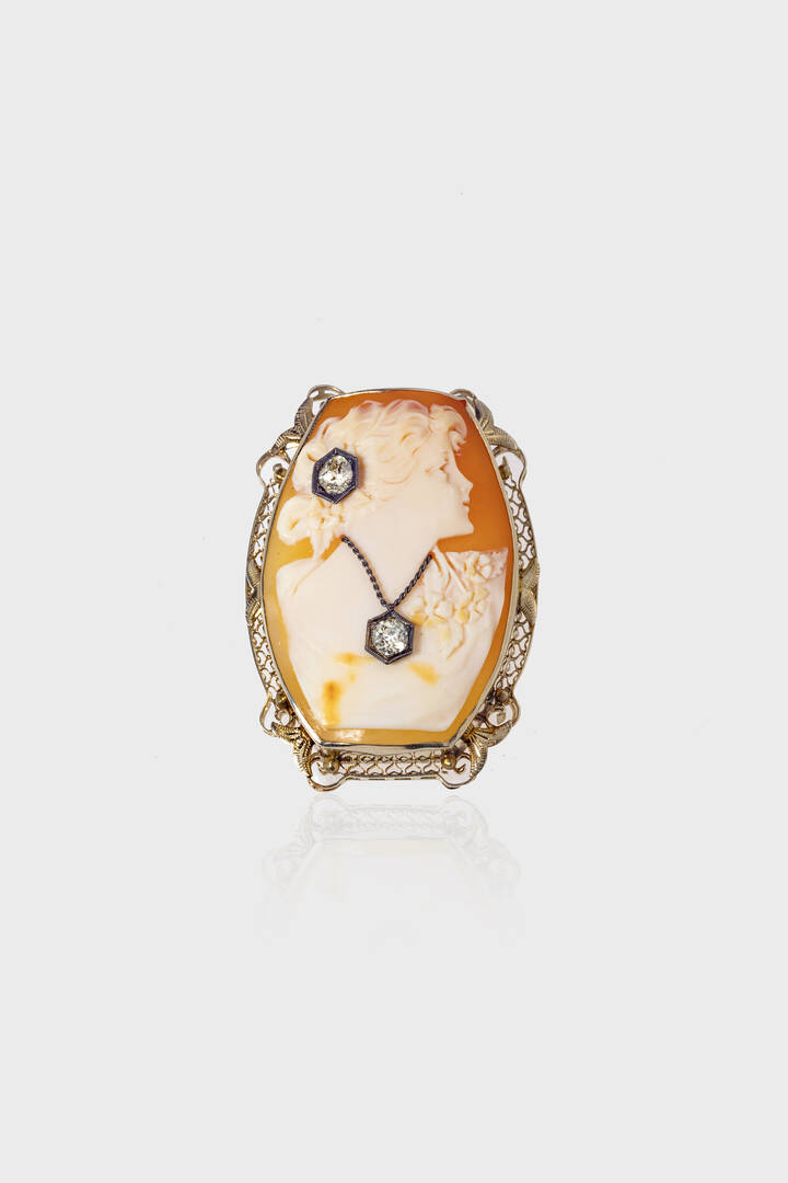 in oro 9 Kt con cammeo raffigurante figura di donna di profilo. Due diamanti di vecchio taglio a decoro per totali ct 0,30 ca
