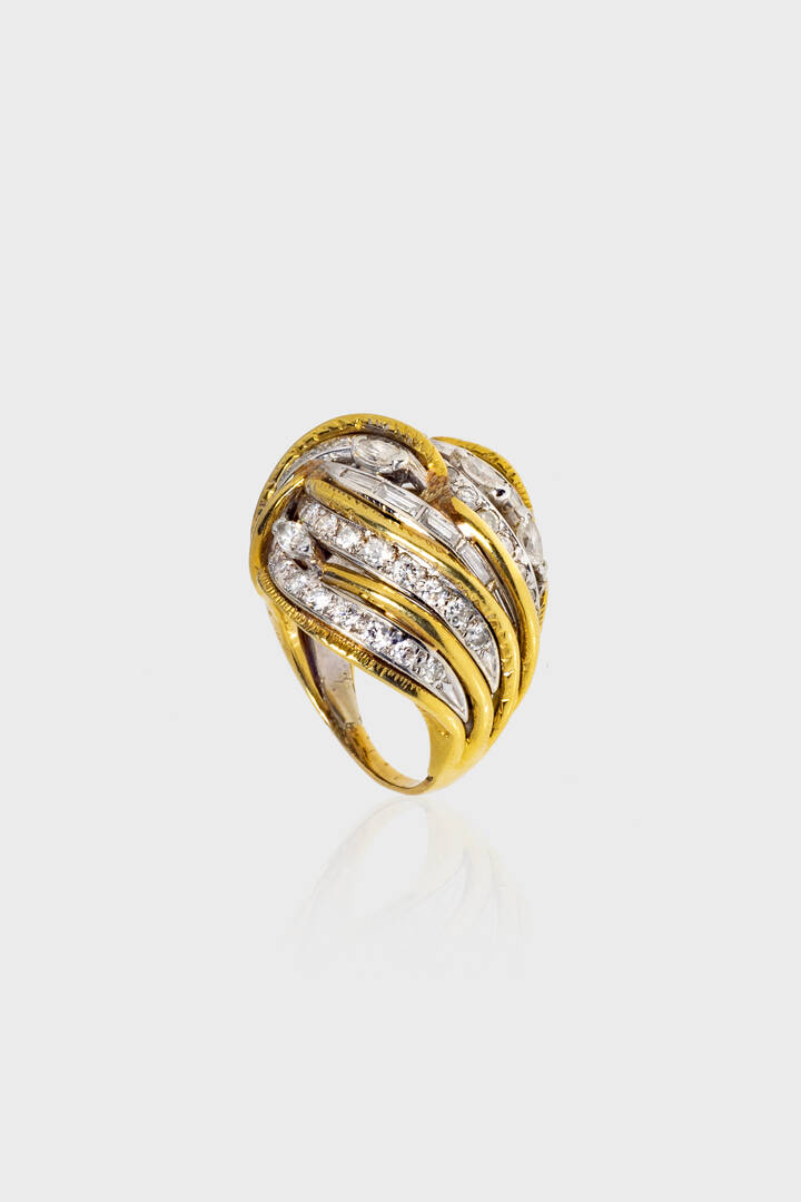 in oro giallo e bianco 14 Kt, sommità con intreccio di foglie in diamanti taglio brillante, navette e baguette per totali ct 1,50 ca, probabile colore G-H, purezza IF-VVS