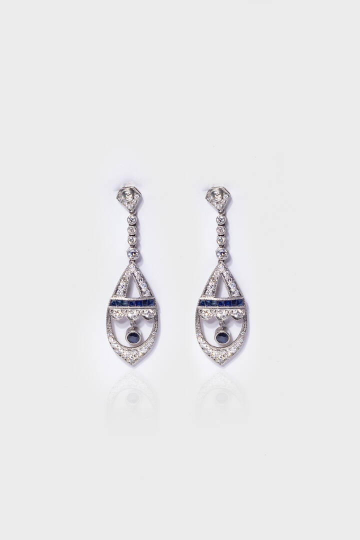 pendenti, platino, anni '920, con diamanti taglio brillante e 8/8 per totali ct 1,0ca. Zaffiri sintetici taglio rotondo e carré a decoro