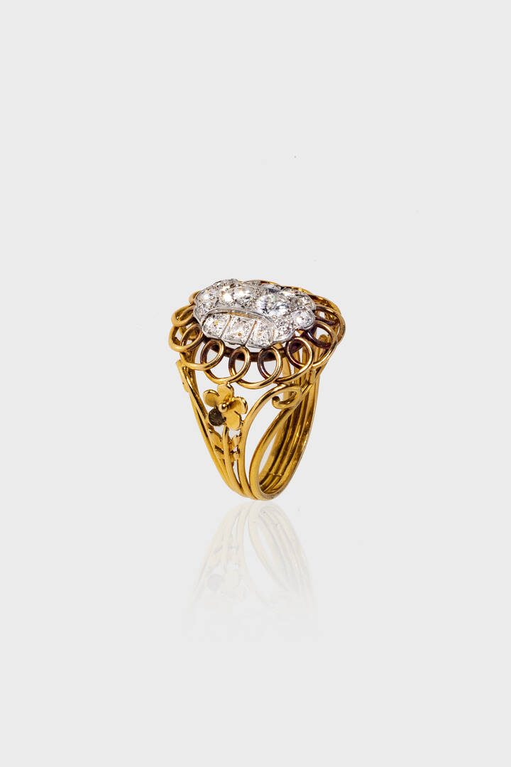 in oro giallo e bianco, punzoni francesi, anni '940, sommità ovale con filo intrecciato e al centro pavé di diamanti taglio brillante di vecchio taglio per totali ct 0,70 ca, probabile colore G-H, purezza IF-VVS.