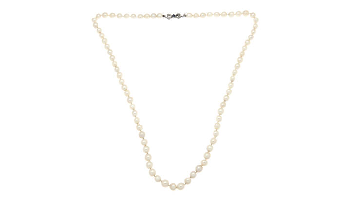 composta da un filo di perle giapponesi dal diam di mm 8,0 a 8,5; chiusura in oro bianco a forma di fiocco con al centro uno zaffiro taglio carré e piccoli diamanti taglio 8/8