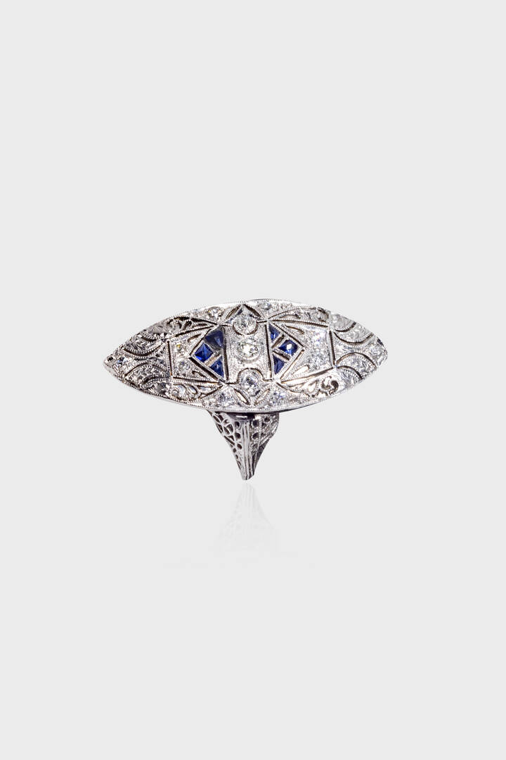 in oro bianco 14 Kt, sommità a losanga, in stile anni '920, con diamanti taglio brillante per totali ct 0,20 ca e piccoli zaffiri.