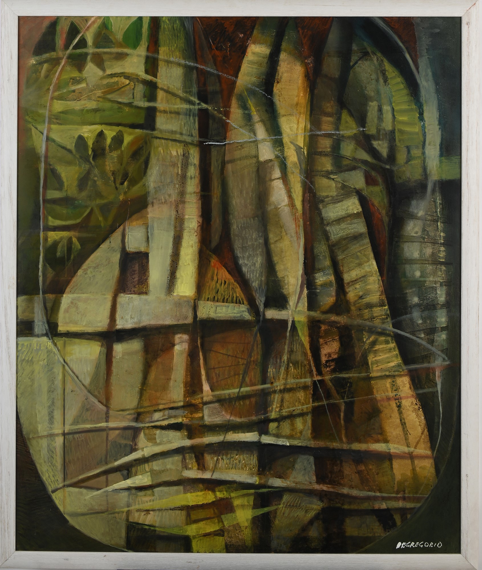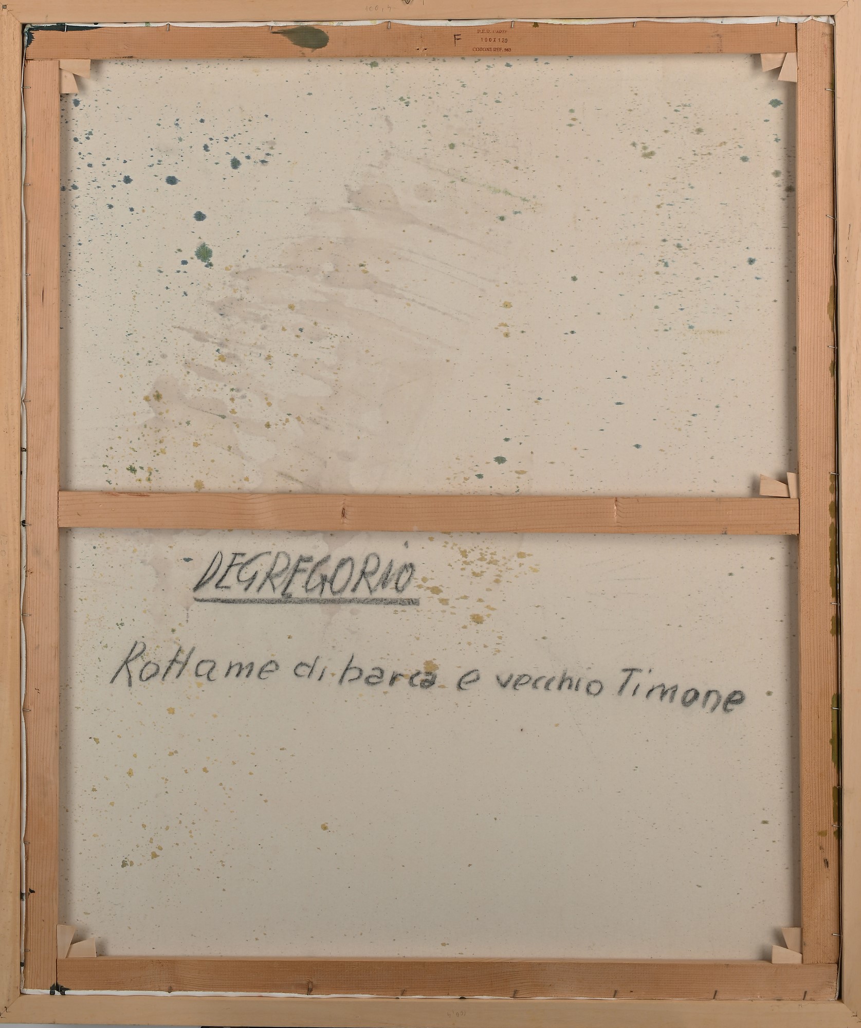 Rottame di barca e vecchio timone Primi anni '80 Olio su tela cm 120x100 - in cornice cm 127x107 Firma in basso a destra "De Gregorio". Al verso reca titolo e firma Certificato di autenticità rilasciato dall'Archivio Opere Giuseppe De Gregorio, Nonantola (MO)