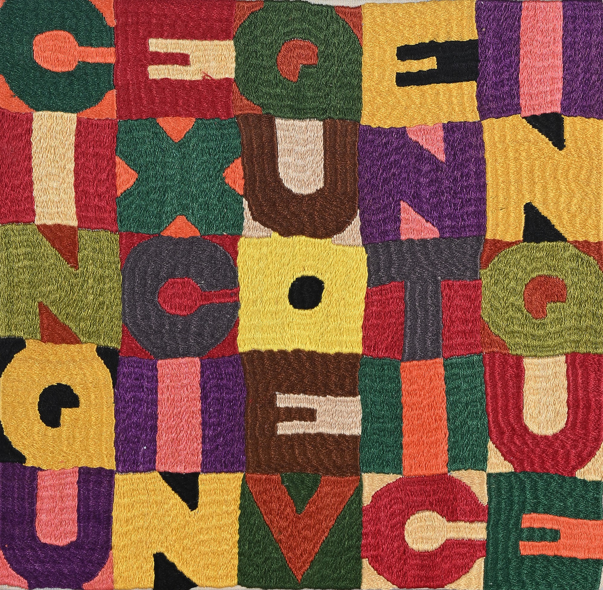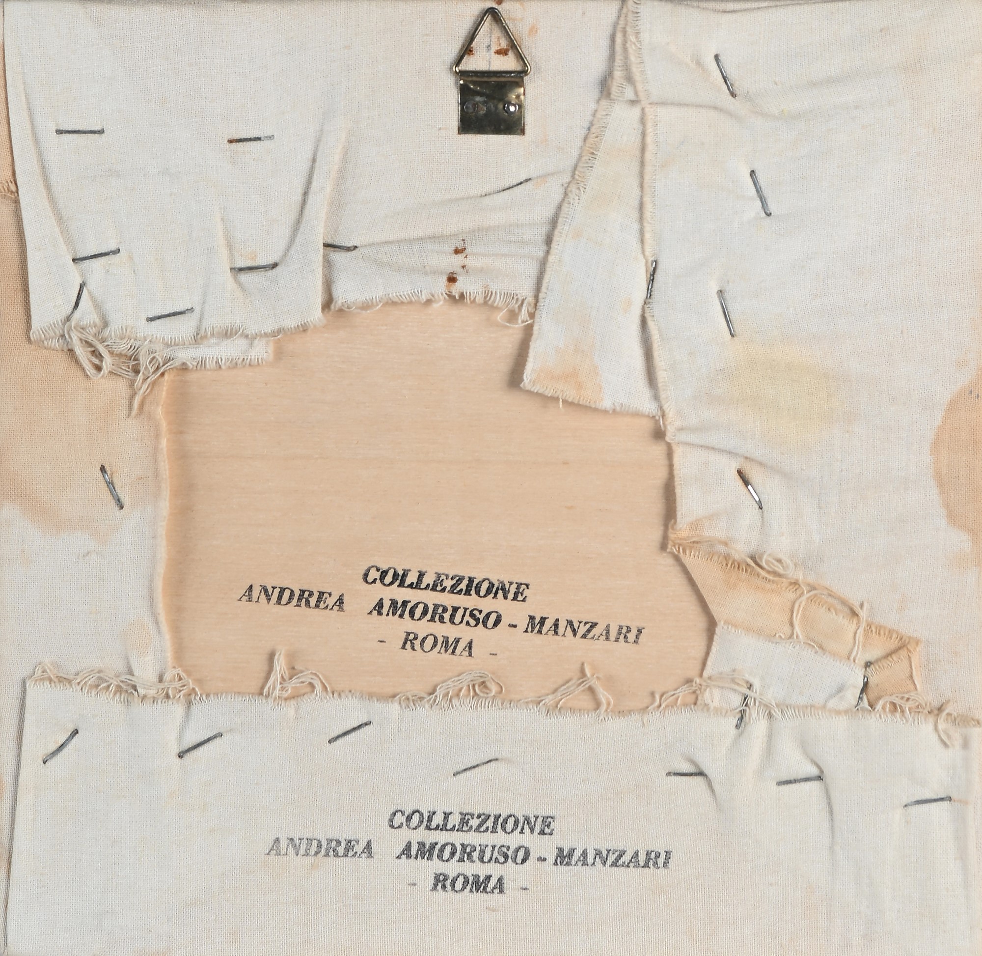 Cinque per cinque venticinque 1988 Ricamo su tela cm 21x21 Al verso reca timbro "Collezione Andrea Amoruso Manzari, Roma". Certificato di autenticità rilasciato dall'Archivio Alighiero Boetti, Roma