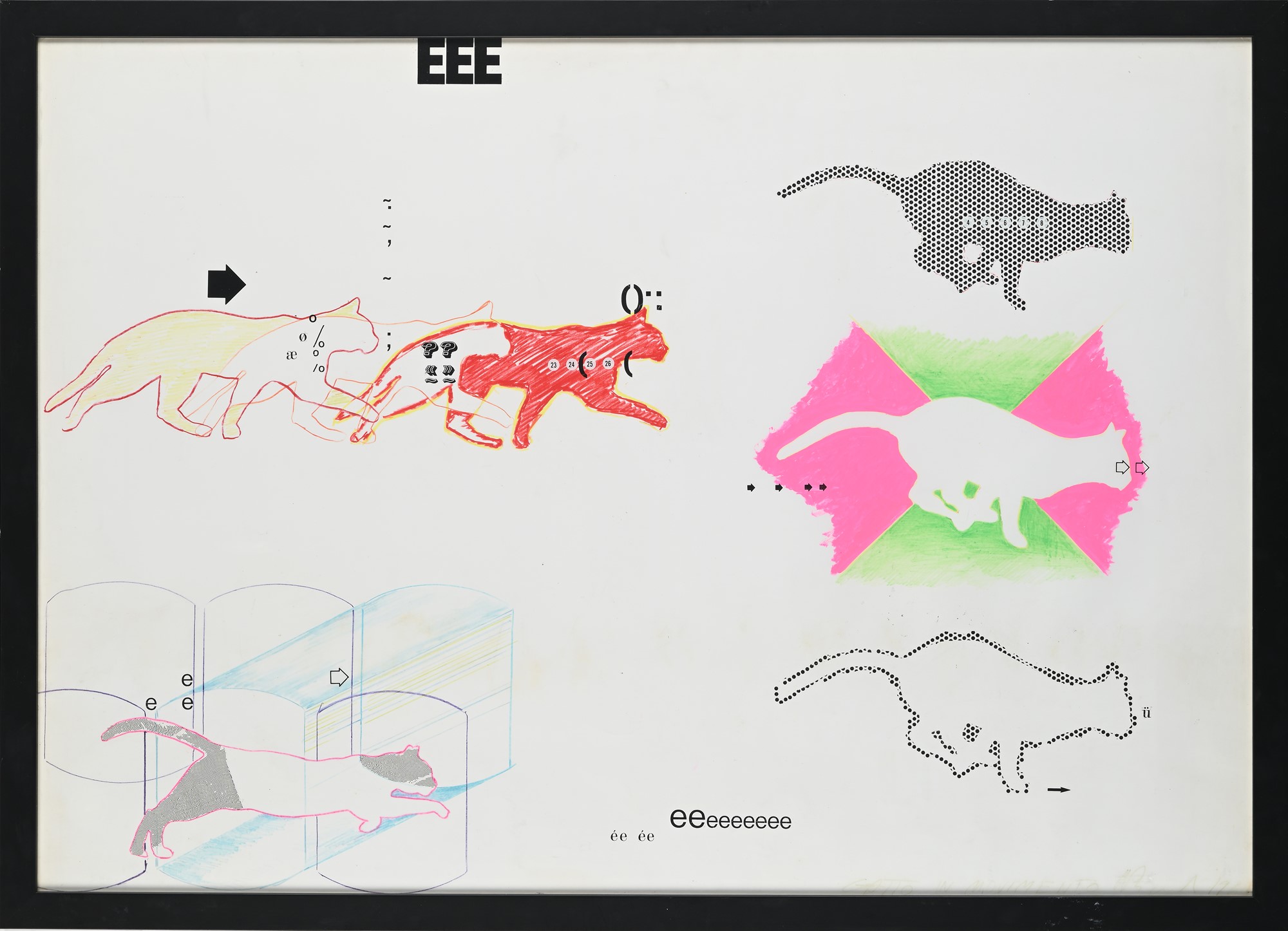 Gatto in movimento Collage, pastelli, smalto e pennarelli su cartoncino cm 70x100 - in cornice cm 75x105 Titolo e firma in basso a sinistra. Al verso reca timbro dell'Associazione Culturale L'Attico, Roma Fotografia dell'opera con timbro dell'Associazione Culturale l'Attico, Roma