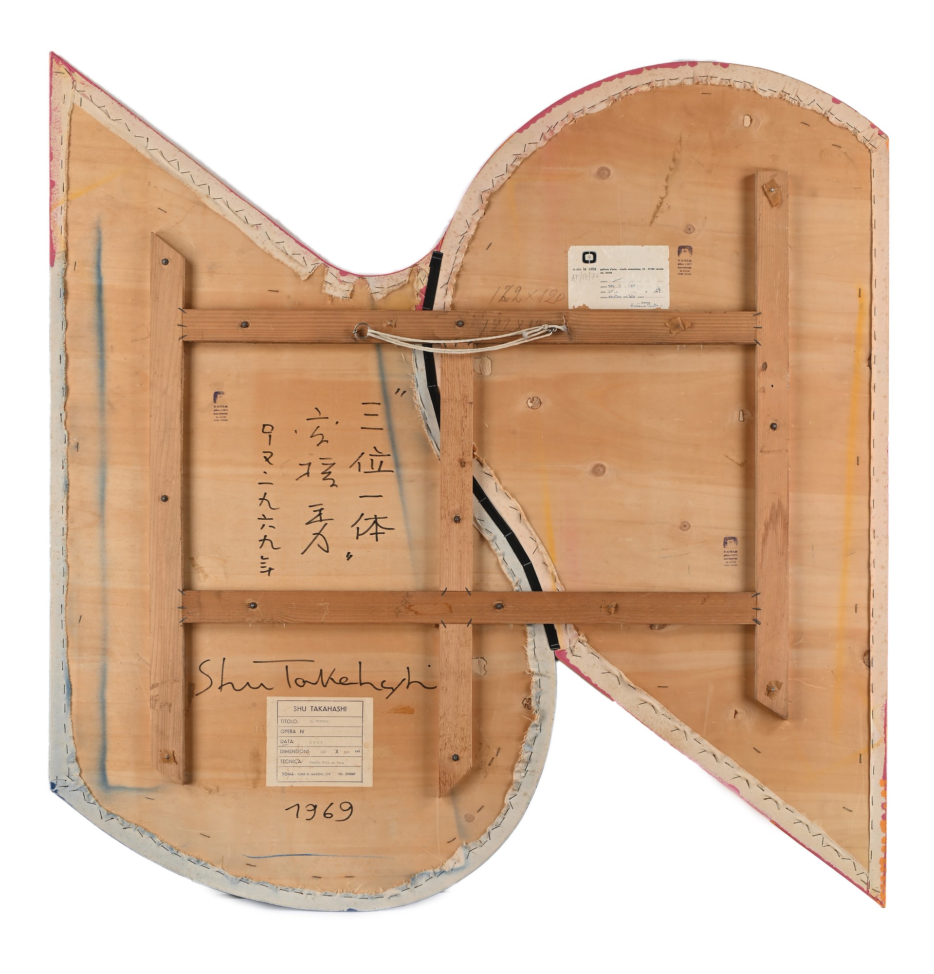 La trinità 1969 Smalto nitrato su tela applicata su tavola cm 122x120 Al verso reca firma e data "Shi Takahashi 1969". Etichetta dello studio Takahashi, Roma. Timbri ed etichetta della Galleria Studio La Città, Roma