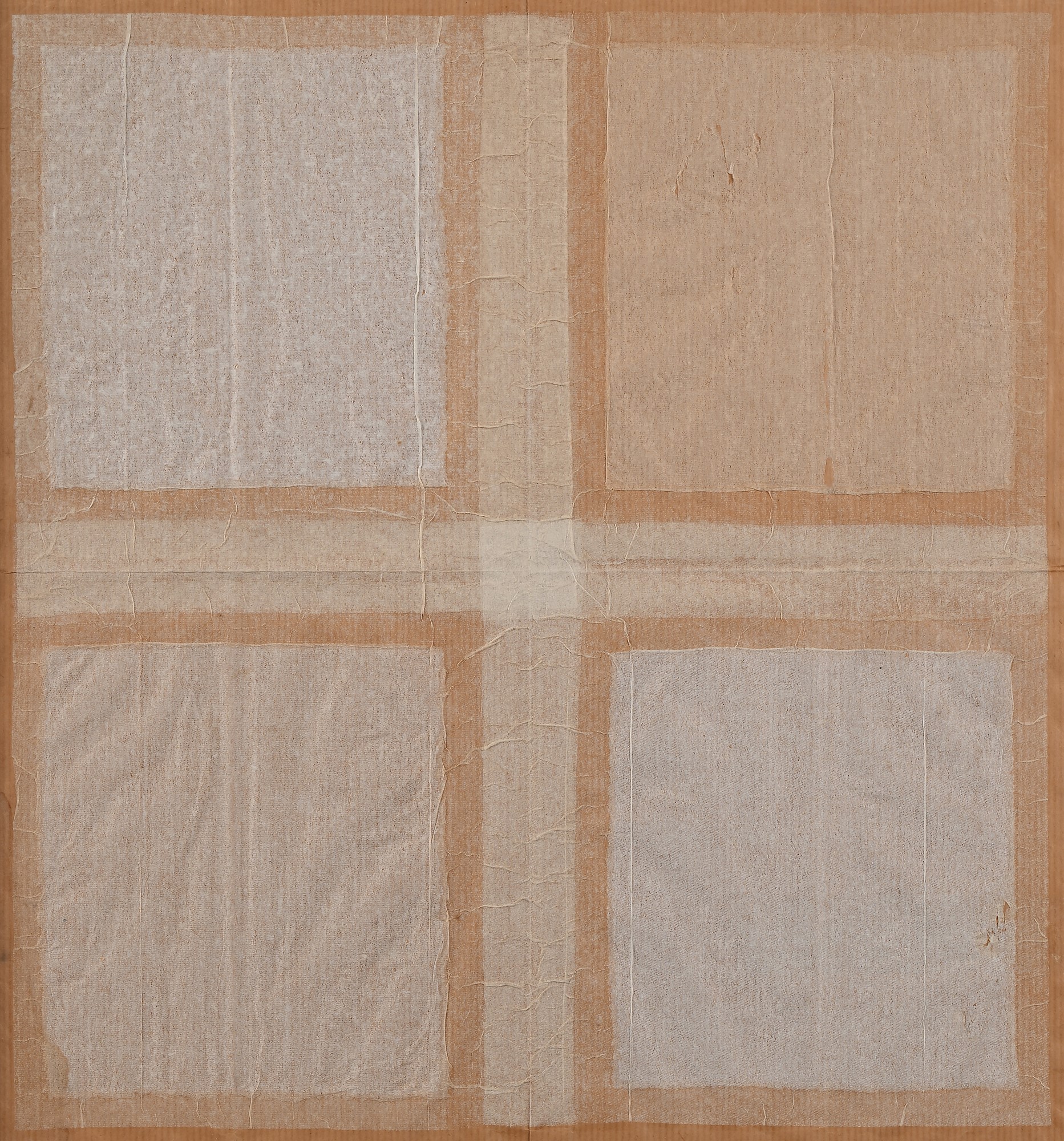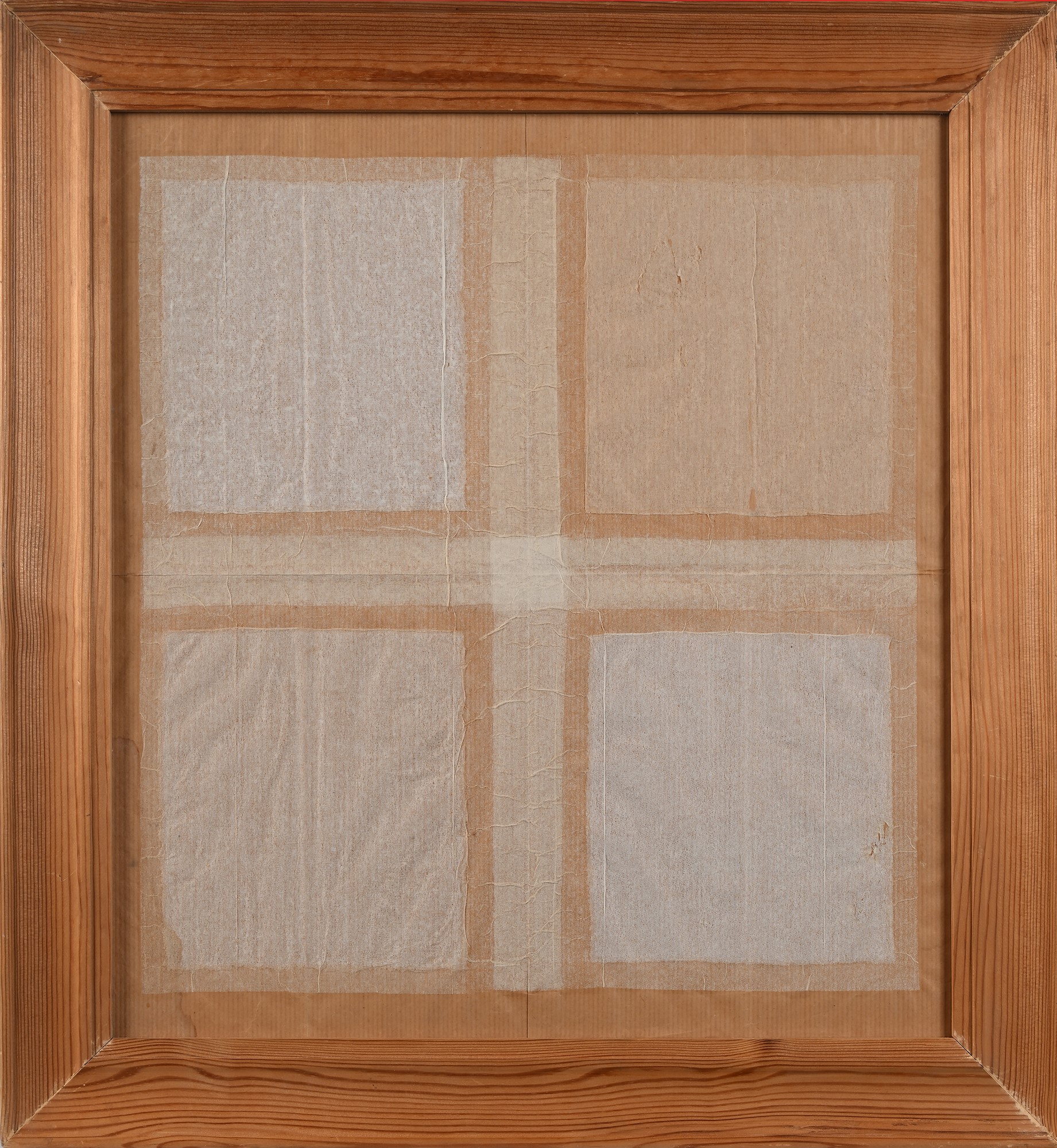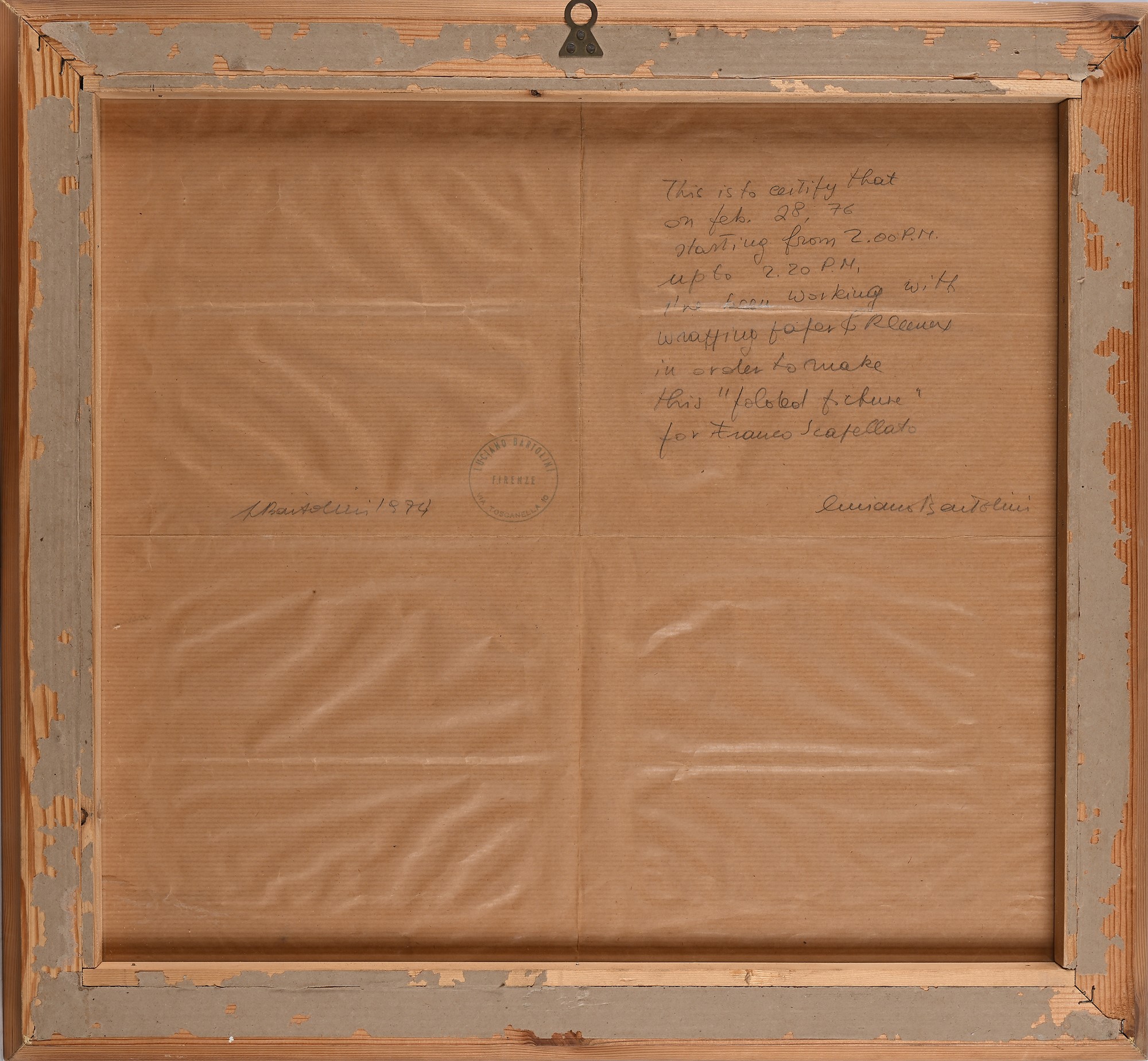 Kleenex 1974-76 Collage di kleenex su carta da pacchi cm 42x47 - in cornice cm 52x57 Al verso reca firma e data "L Bartolini 1974". Timbro "Luciano Bartolini Firenze". Dedica ed autentica firmata di pugno dell'artista.