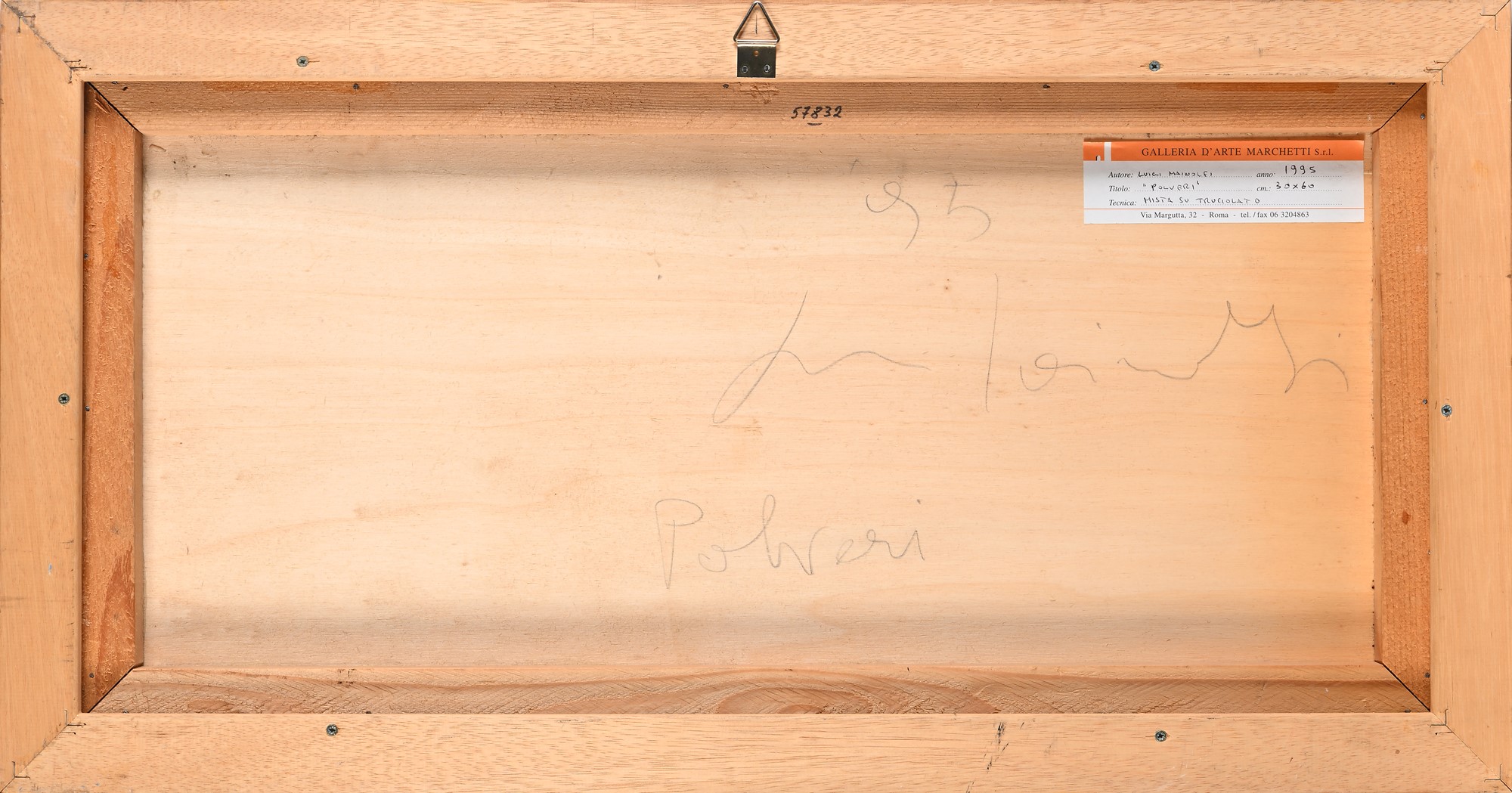 Polveri 1995 Tecnica mista su tavola cm 30x60 - in cornice cm 33x63 Firma, titolo e data al verso "Luigi Mainolfi '95, Polveri". Etichetta della Galleria d'Arte Marchetti, Roma