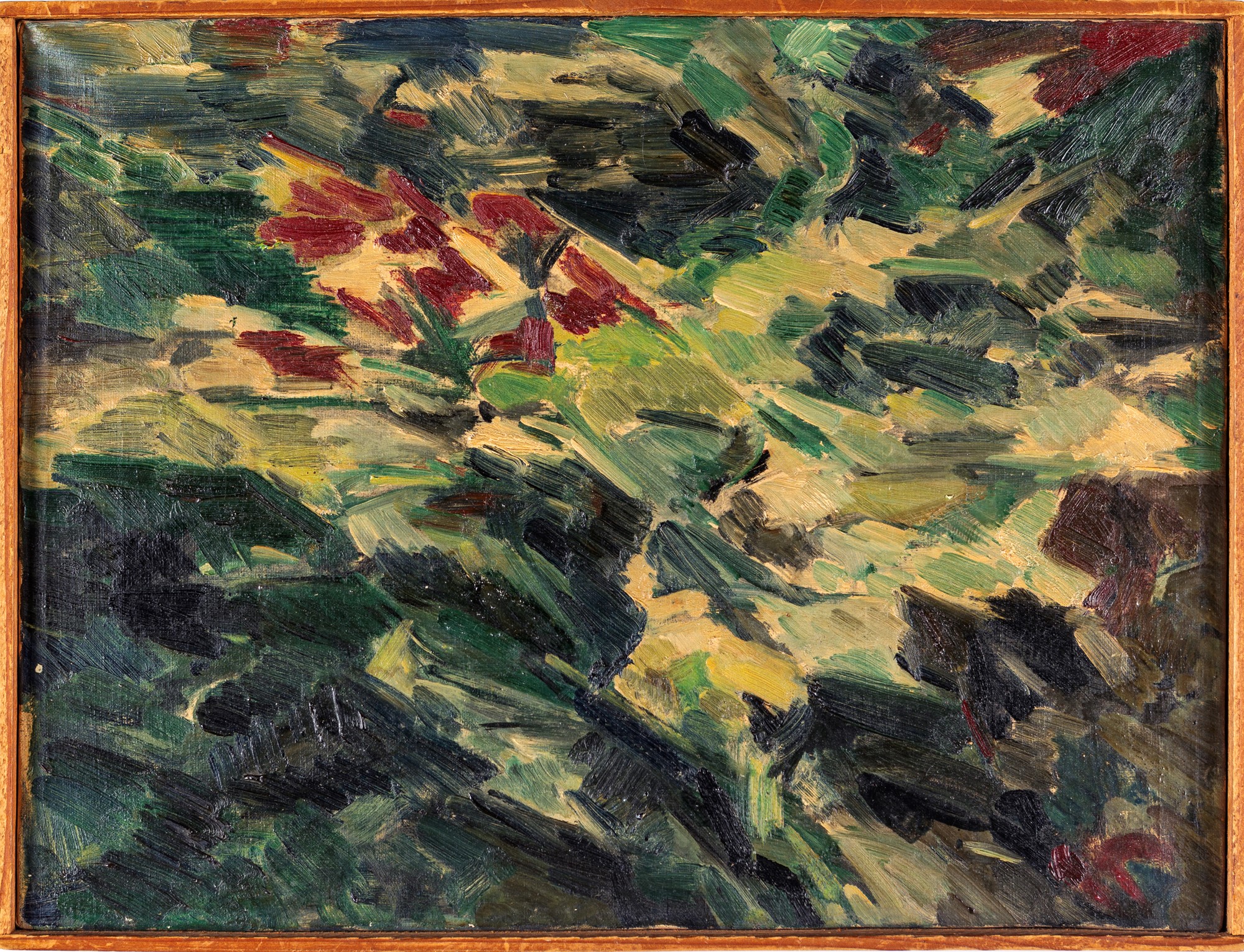 Senza titolo Anni '40 Olio su tela cm 30x40 - in cornice cm 31,5x41 Al verso reca firma dedica e data "all'ingegnere Ferriani e Signora con gratitudine E. Vedova Terminillo Maggio 1956". Certificato di autenticita rilasciato dalla Fondazione Emilio e Anna Bianca Vedova