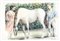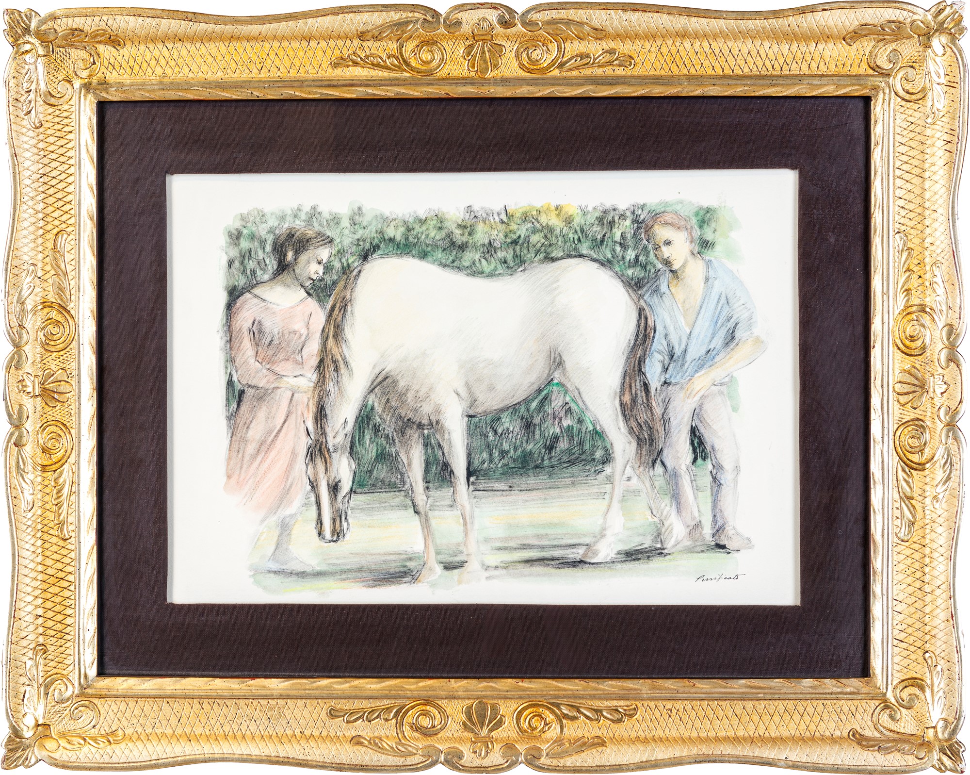 Due figure con cavallo Acquarello su carta applicata su tela cm 35x50 - in cornice cm 58x73 Firma in basso a sinistra "Purificato"