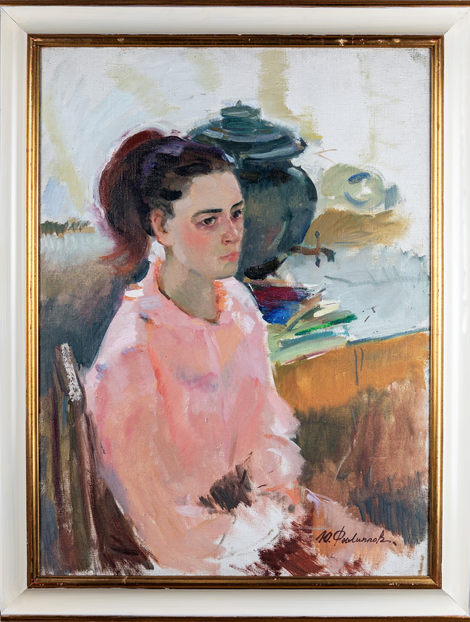 Giovane donna e samovar Olio su tela cm 80x60 - in cornice cm 94x74 Firma in basso a destra. Russia, i colori della neve, impressionismo e realismo sovietico, Carlo Maria Biagiarelli Antiquario, pag. 51 n.85 Roma, Carlo Maria Biagiarelli Antiquario, Russia, i colori della neve, impressionismo e realismo sovietico, 2013