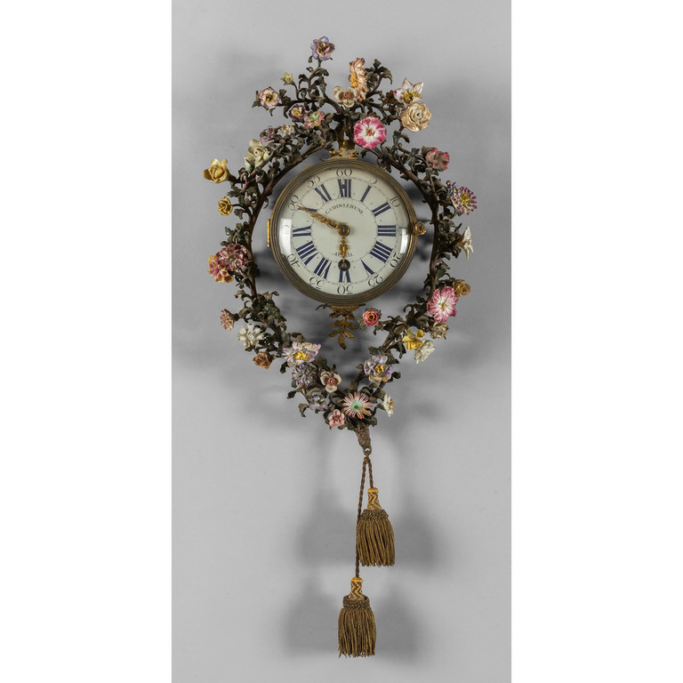 Orologio a Cartel in bronzo dorato e laccato con ricca decorazione di fiori in porcellana policroma di Chantilly macchina firmata Gudin Le Jeune a Paris Francia metà sec.XVIII