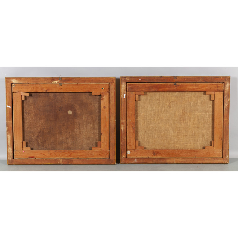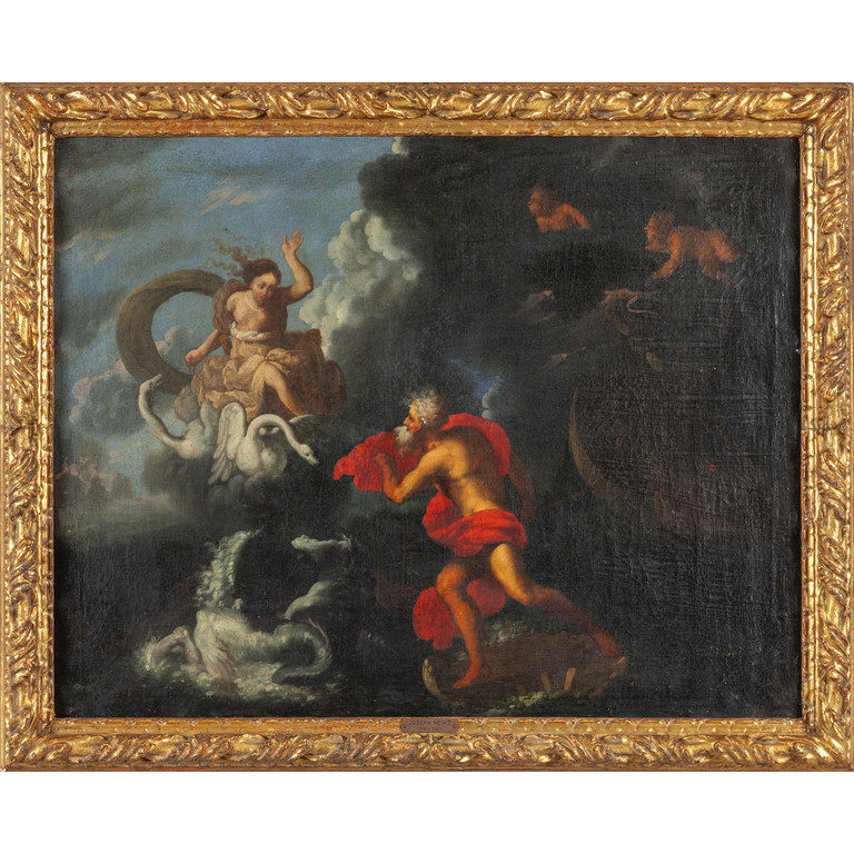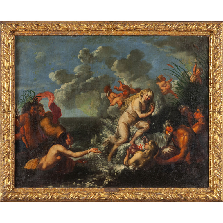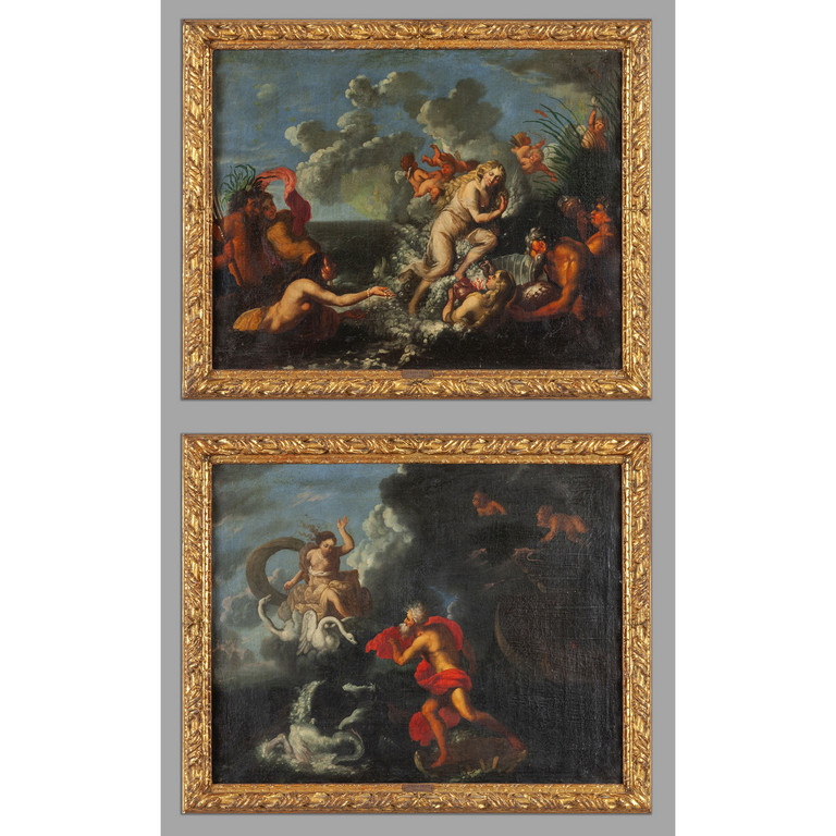 Scuola francese sec.XVII 'Allegorie del mare' coppia di olii cornici in legno intagliato e dorato