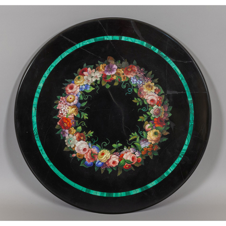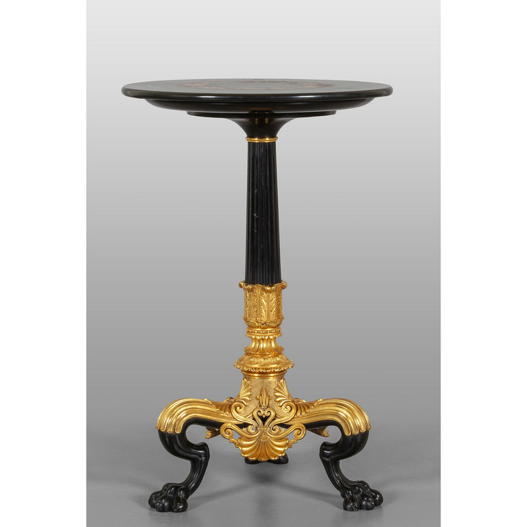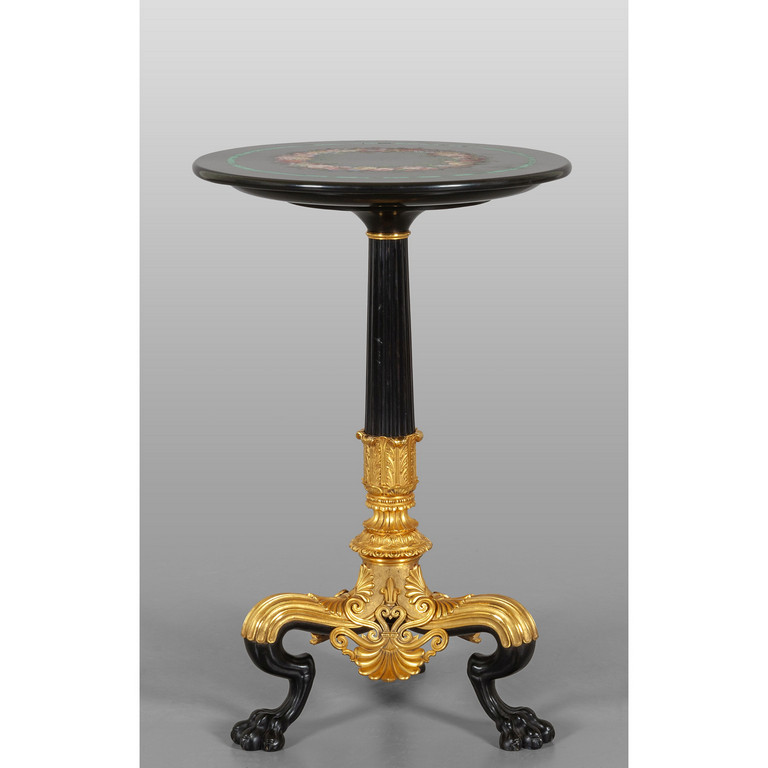 Tavolino in bronzo brunito e dorato a tre gambe di forma ferina pianetto in marmo intarsiato a fiori in policromia a micromosaico (restauri) sec.XIX