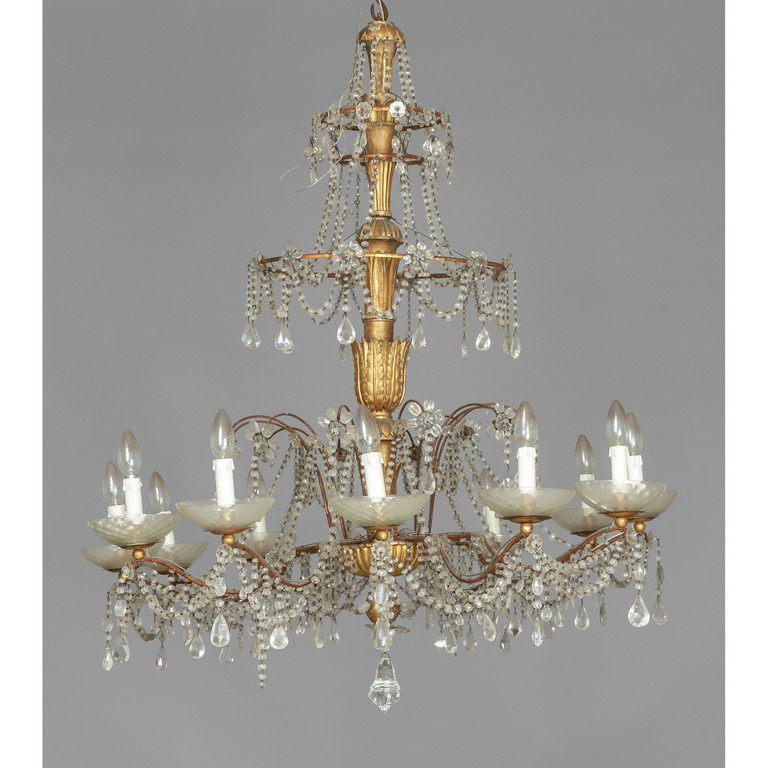 Lampadario Luigi XVI a dodici luci in legno intagliato e dorato ricca applicazione in cristalli di Rocca Genova II metà sec.XVIII